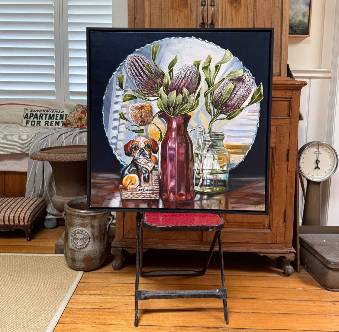 Features a Vintage Pie crust mirror, a 1950’s ceramic beagle bookend, a bakelite thermos as a vase and an old fowlers bottling jar both holding Australian Banksia.