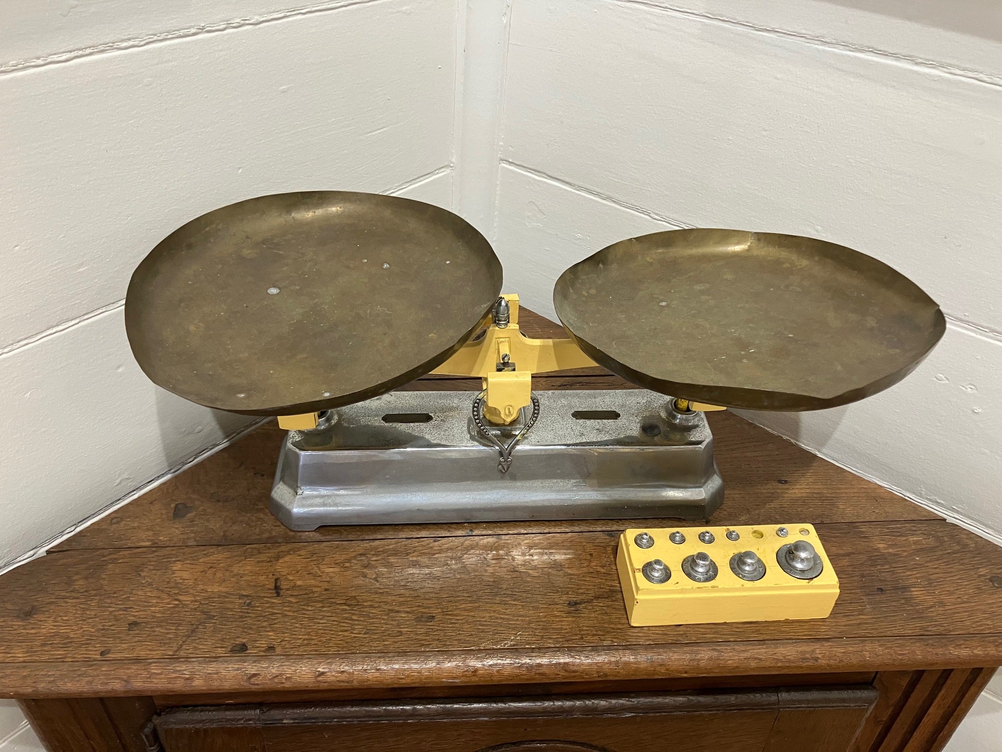 Lovely Vintage French Yellow Kitchen Scales with Silver Base and Plates.
