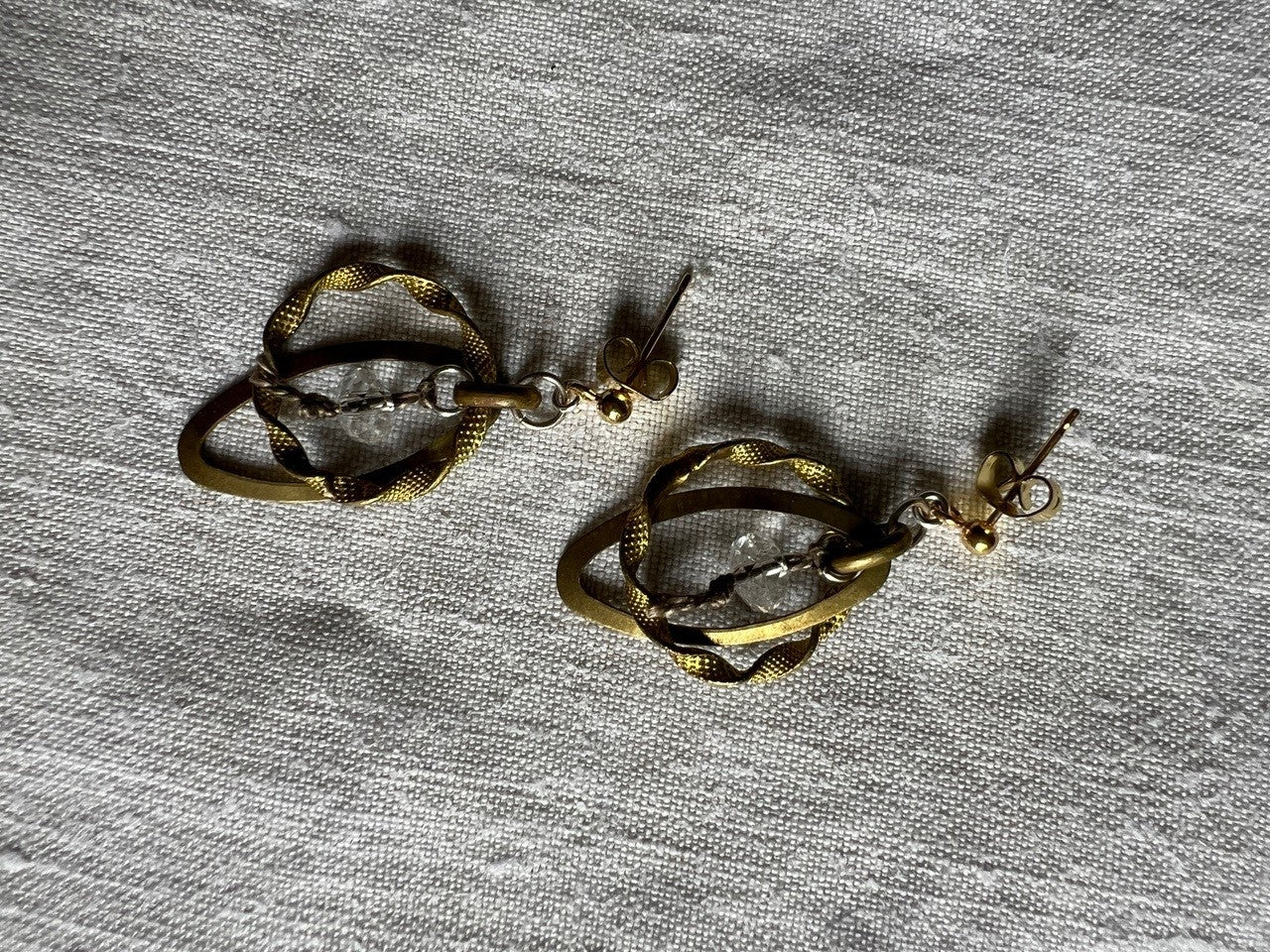 Earrings - Antique brass ribbon ring and brass oval with silk thread and crystal bead on gold plated studs