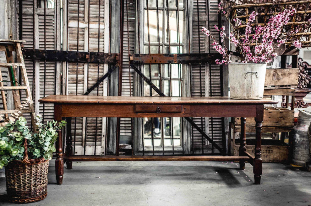 A beautifully aged antique French table with central drawer, curved edges, turned legs and central stretcher bar