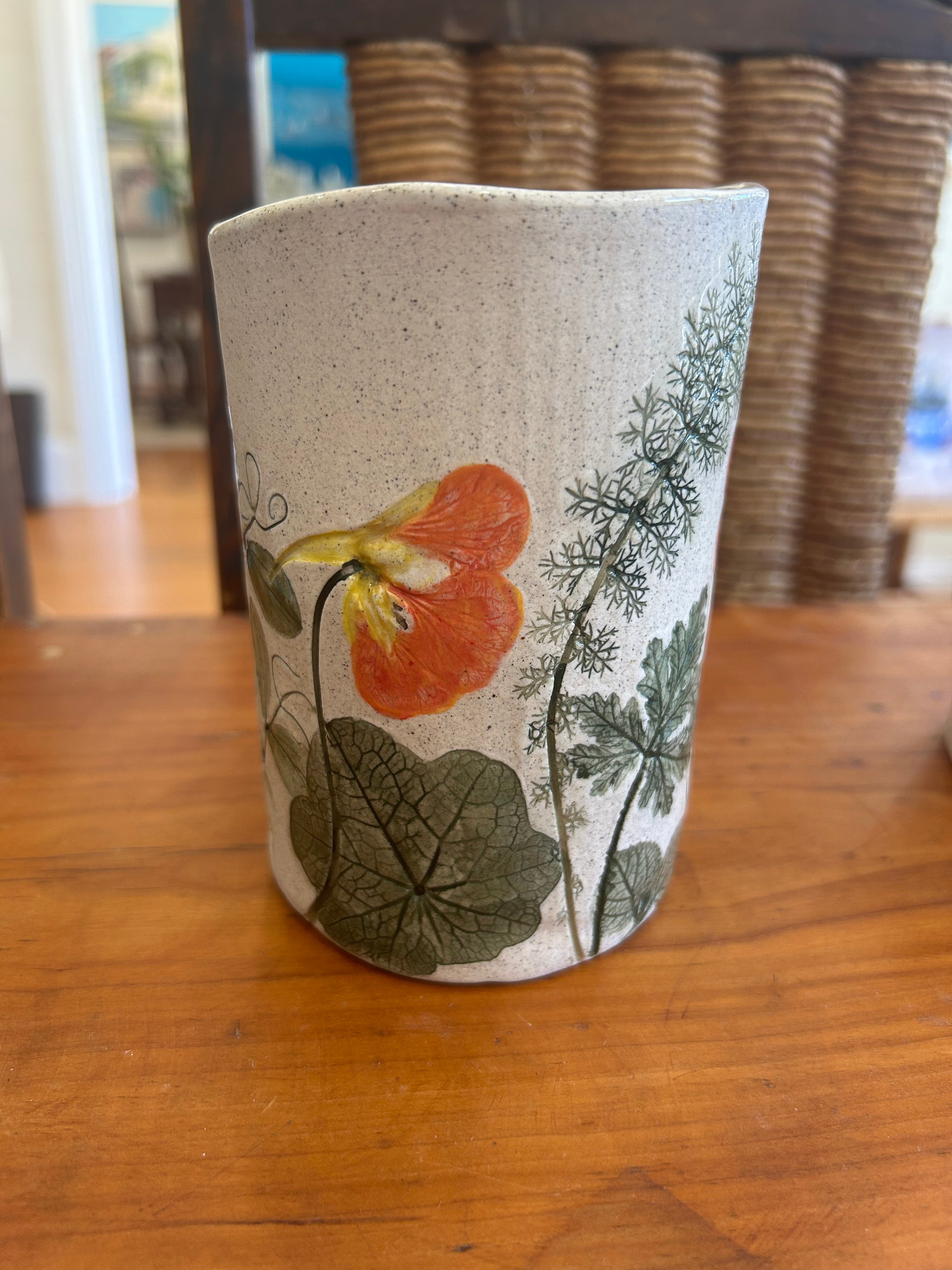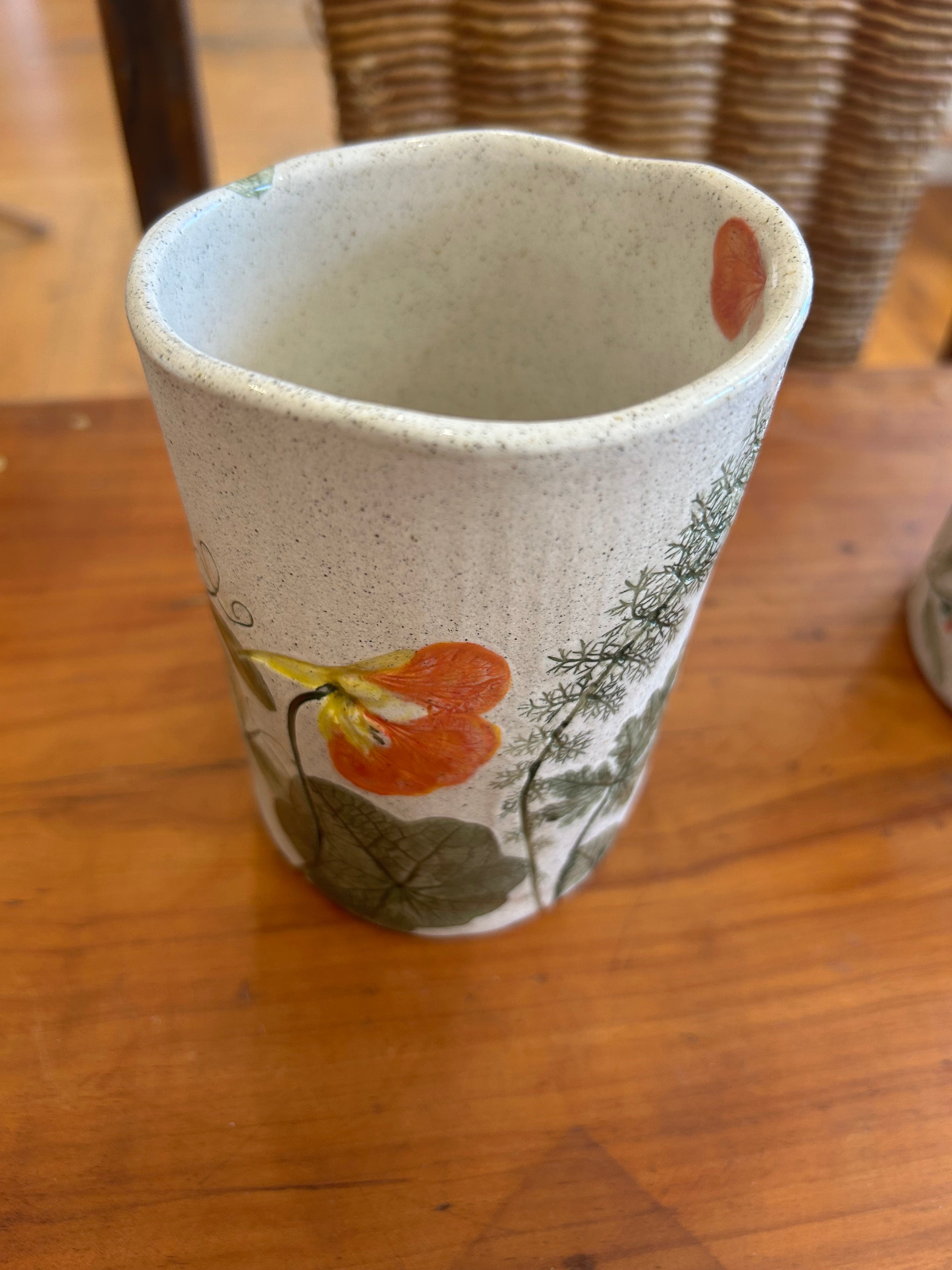 Each piece is unique & made with love. All flowers, leaves & vegetables are rolled into the clay then hand painted.