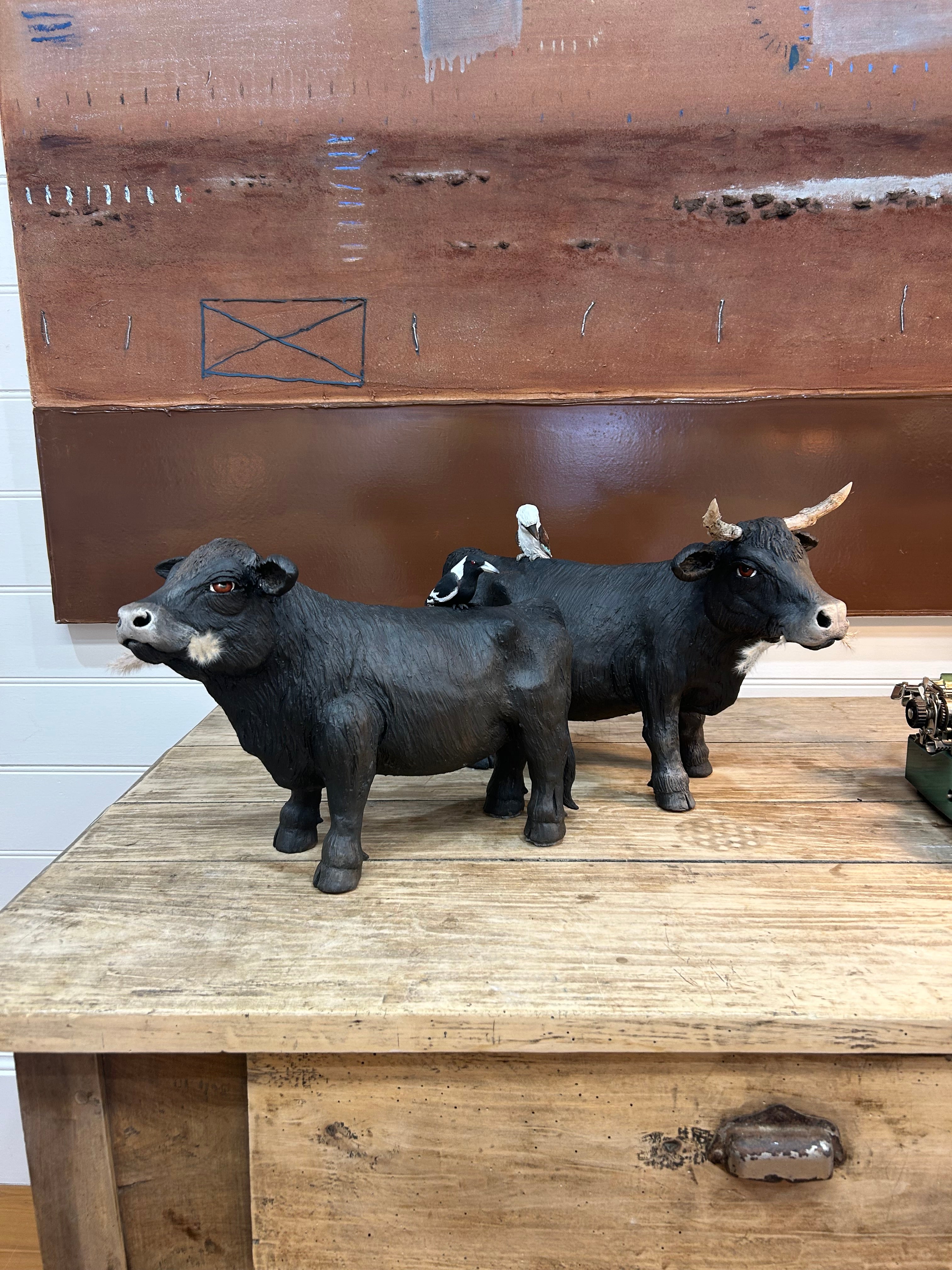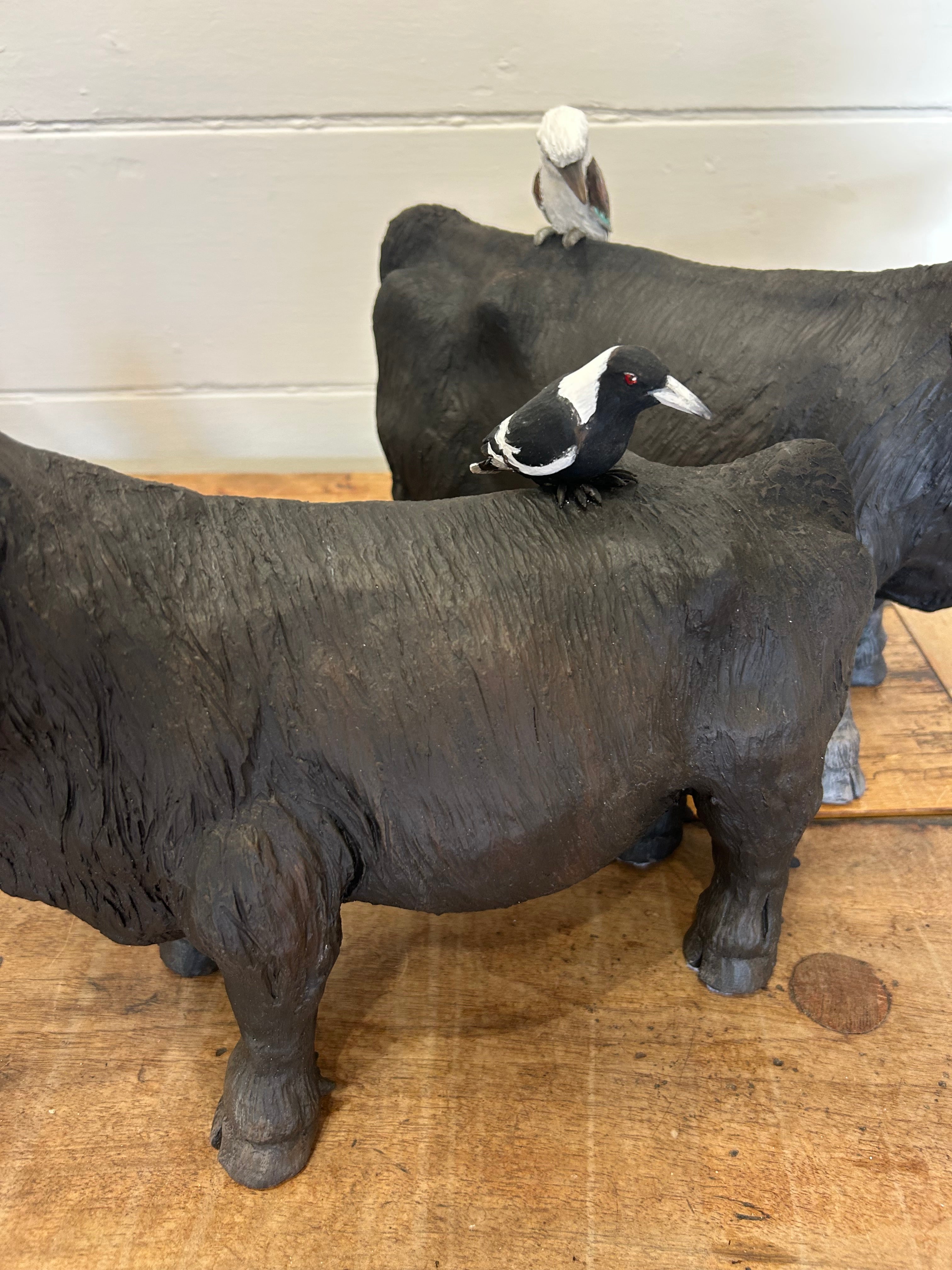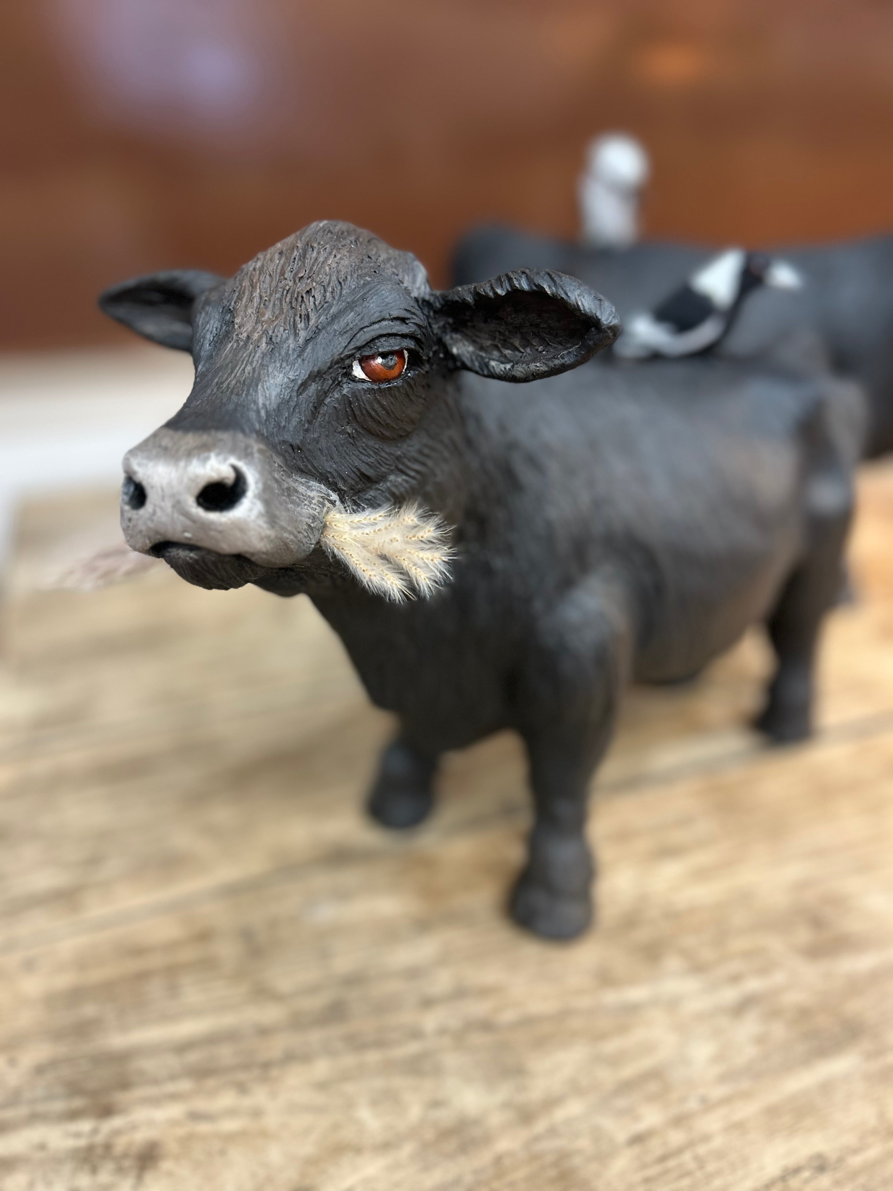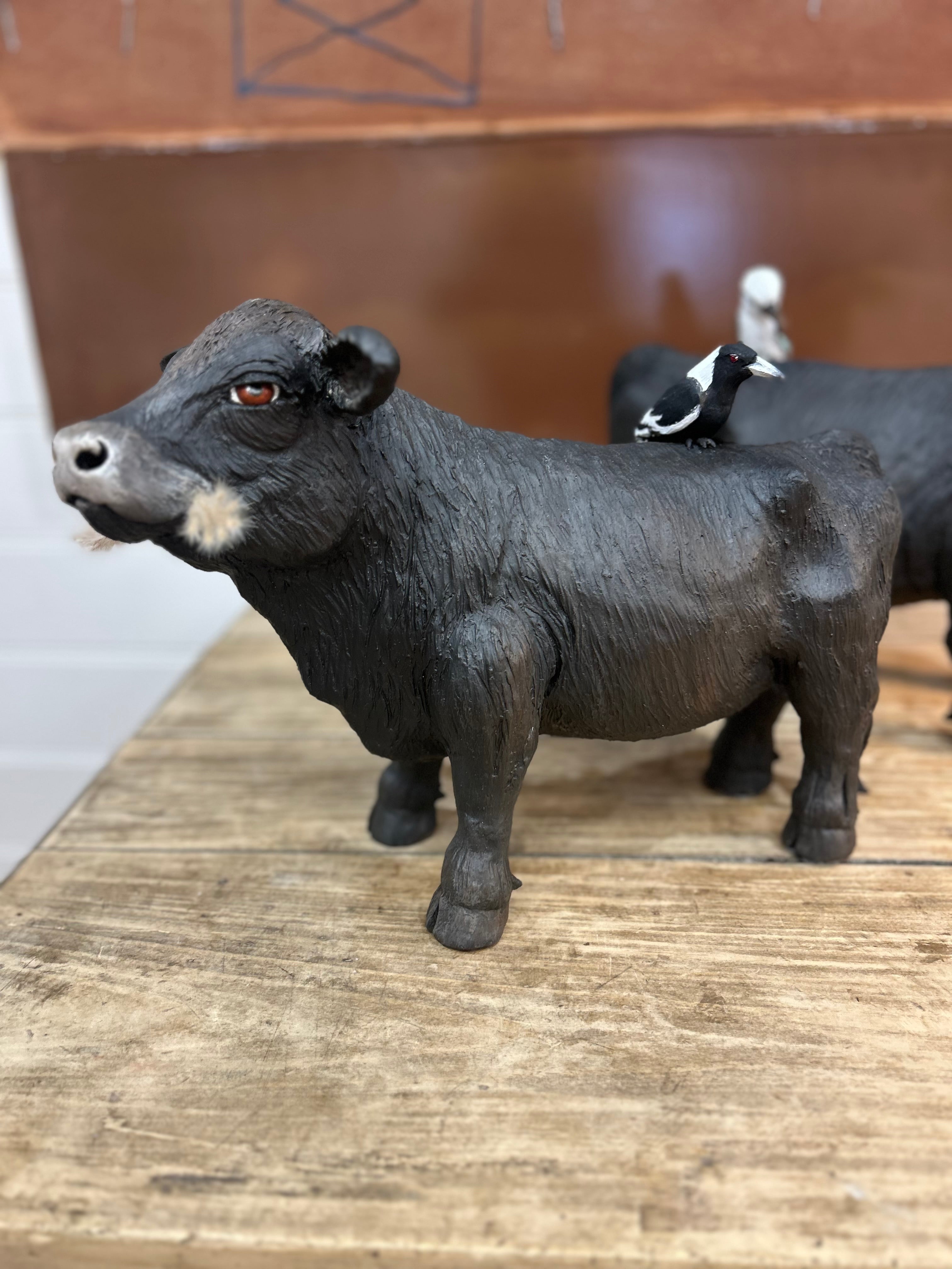 Angus Bull (with Magpie) Hand Painted Clay Sculpture